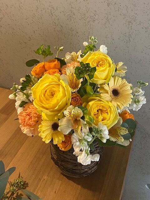 バラやカーネーションを入った、ふんわりかわいいアレンジです。